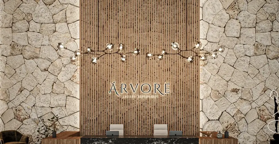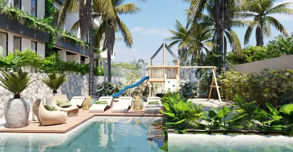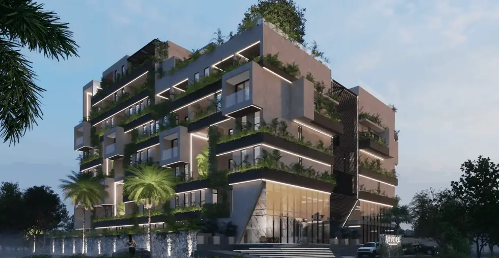 Apartments for sale in Cancun. ARVORE CANCUN is a residential tower with 63 one-, two-, and three-bedroom apartments for sale. Arvore Cancun includes 16 amenities: a rooftop with a Jacuzzi, a movie theater, a bar and lounge, a family and adult pool, a barbecue area, a paddle tennis court, a gym, coworking and coffee shops, a children's playground, gardens, a pet track, guest suites, a concierge, a motorized lobby, controlled access, 24/7 security, and more.