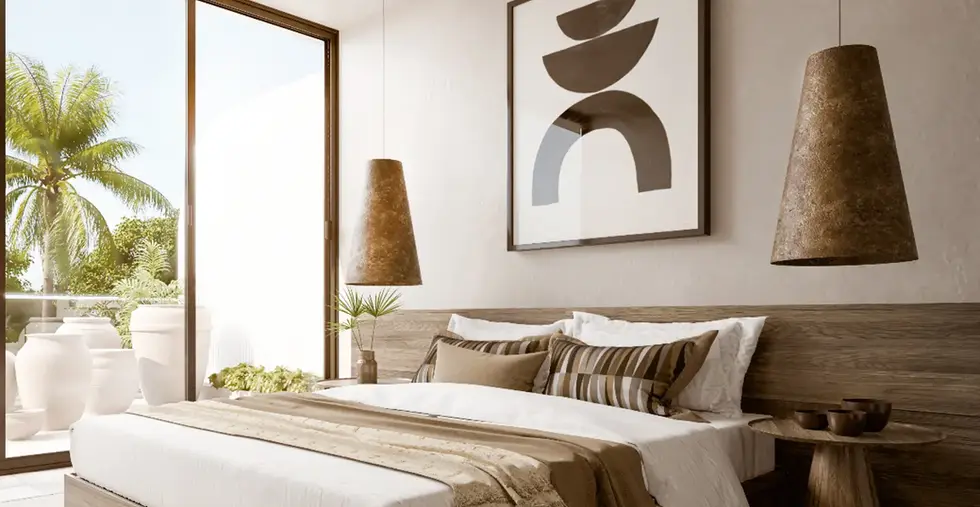 Muuk Karant Tulum is characterized by a harmonious combination of natural elements, minimalism, neutral and earthy colors, integration of indoor and outdoor spaces, ethnic and artisanal elements, and soft, natural elements. This style creates a sophisticated, peaceful, and connected environment.